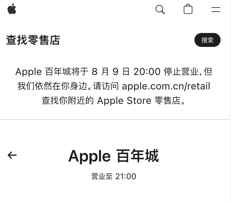 南方+记者注意到,苹果中国官网显示,位于辽宁省大连市的Apple百年城店将于8月9日 20:00 停止营业。